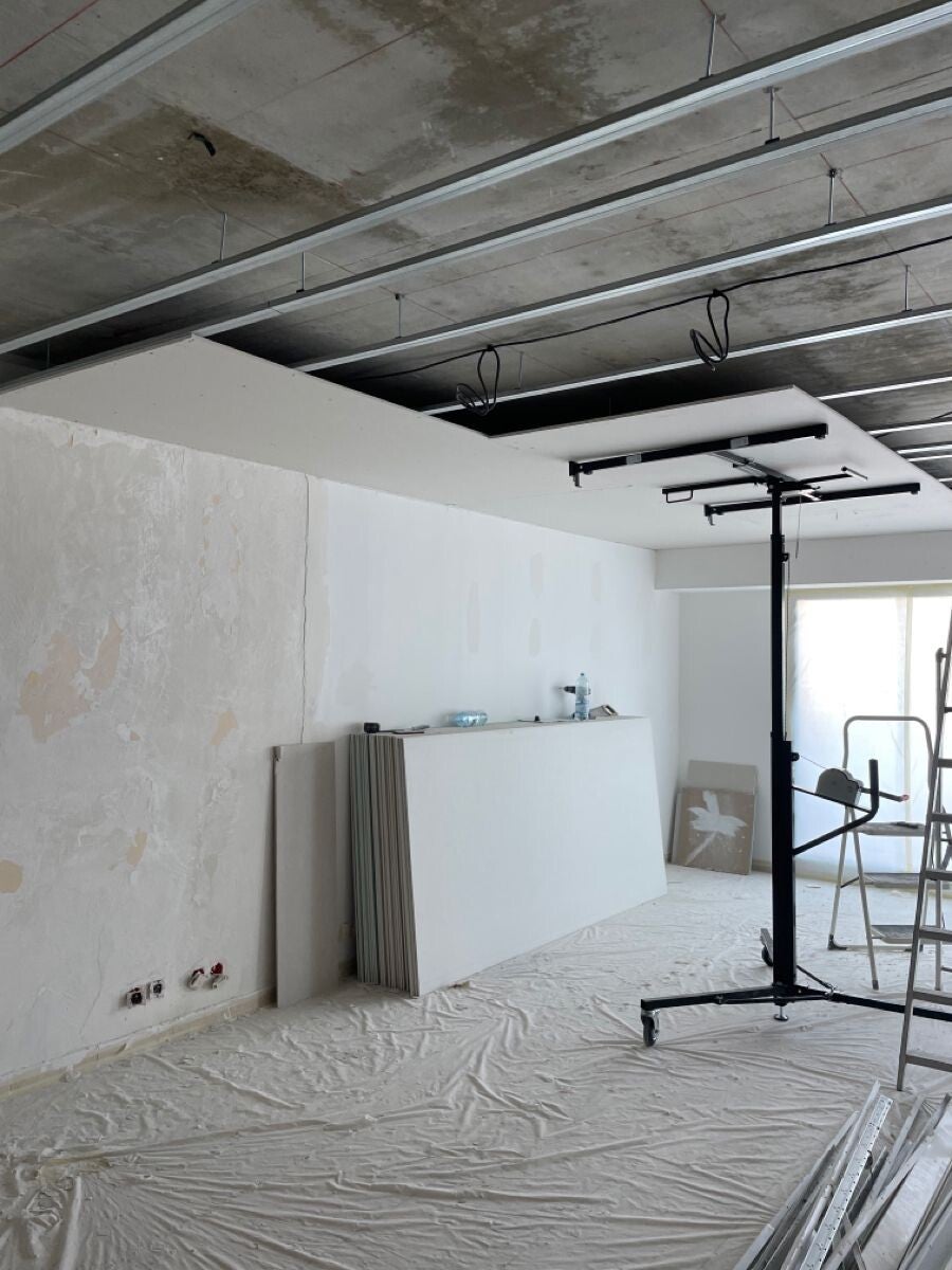 Le plafonnage avec plaques de Gyproc consiste à recouvrir les murs ou plafonds avec des plaques de plâtre prêtes à poser, au lieu d’appliquer du plâtre traditionnel.
